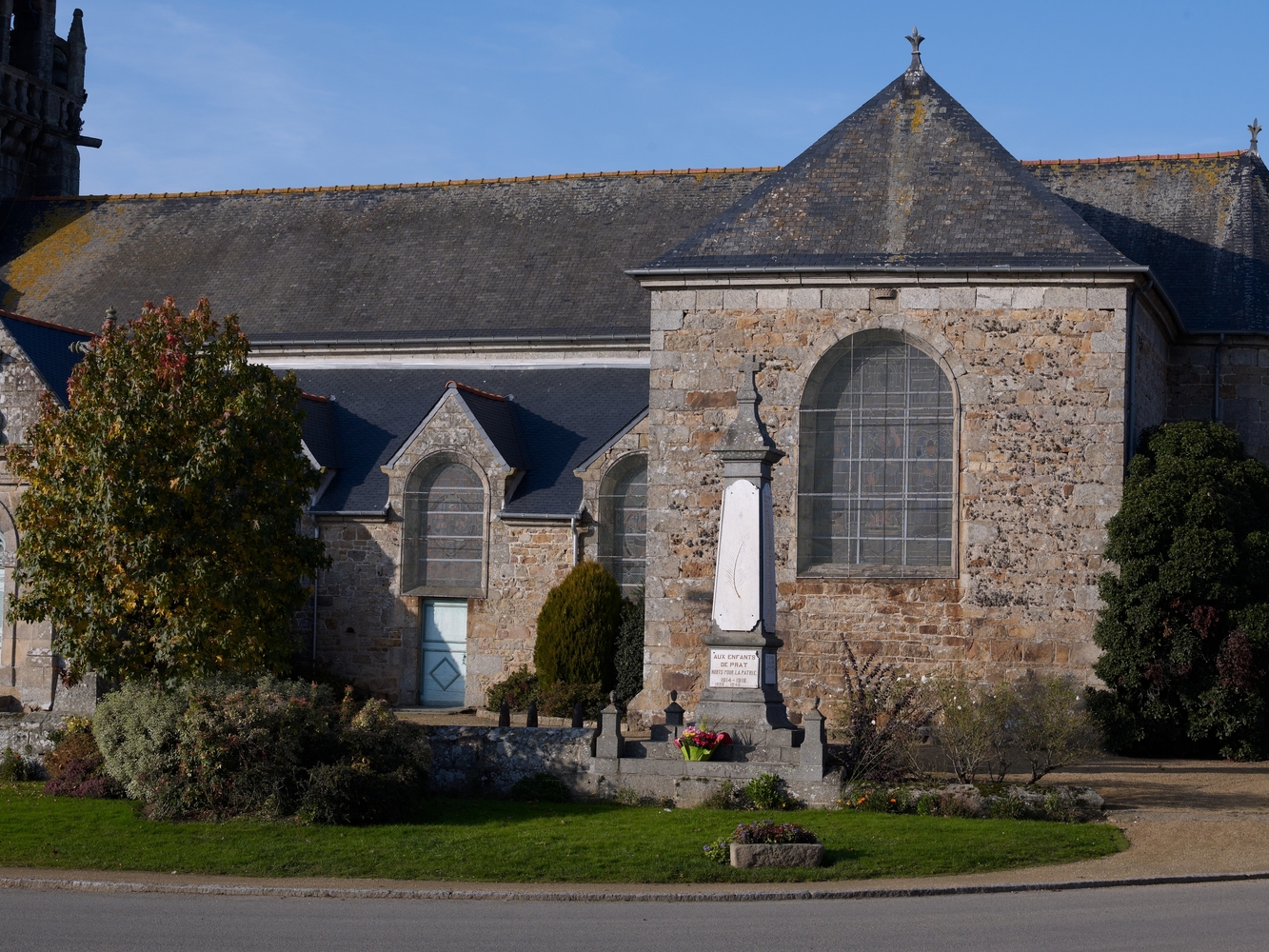 Prat, le bourg : église paroissiale Saint-Pierre, transept sud, vue générale. Au premier plan : le monument aux mortsImmatriculation