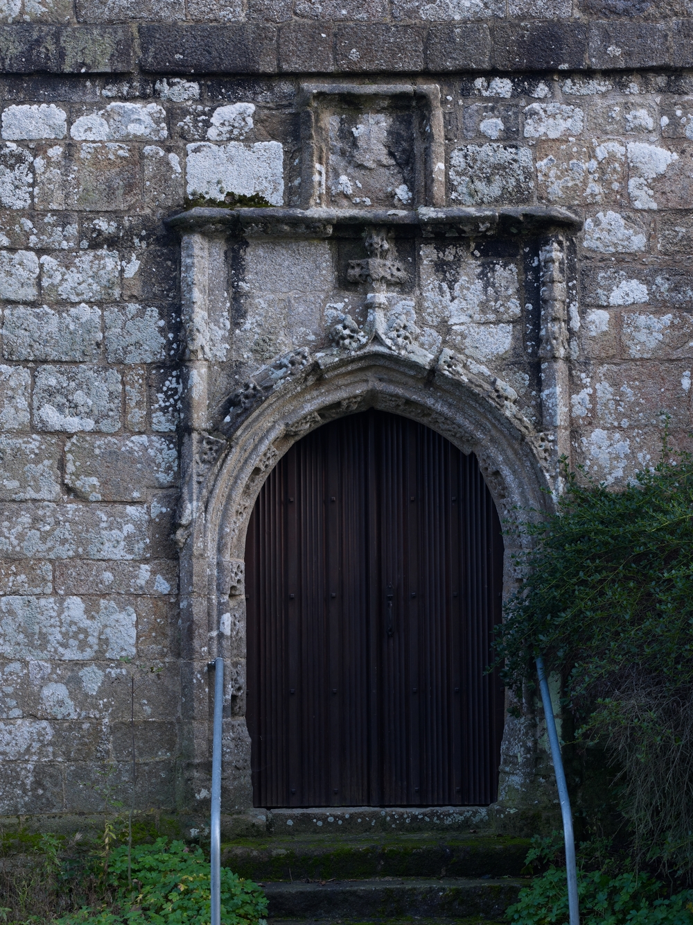 Prat, Trévoazan : chapelle Saint-Jean de Trévoazan, porte ouest, vue de détail (état en 2012)Immatriculation