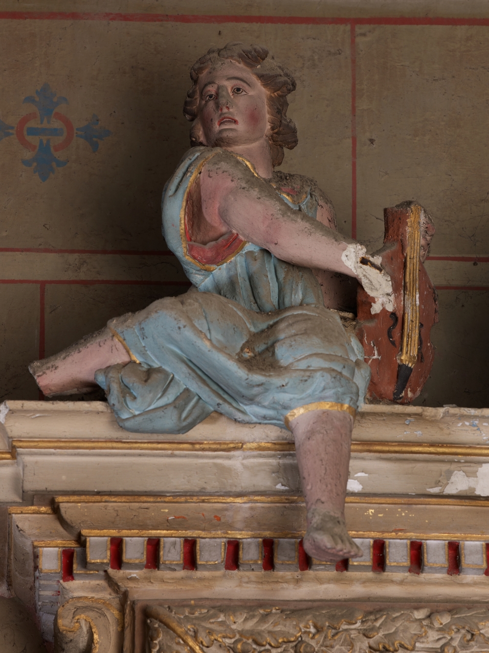 Prat, le bourg : église paroissiale Saint-Pierre, vue intérieure, retable sud, ange musicienImmatriculation