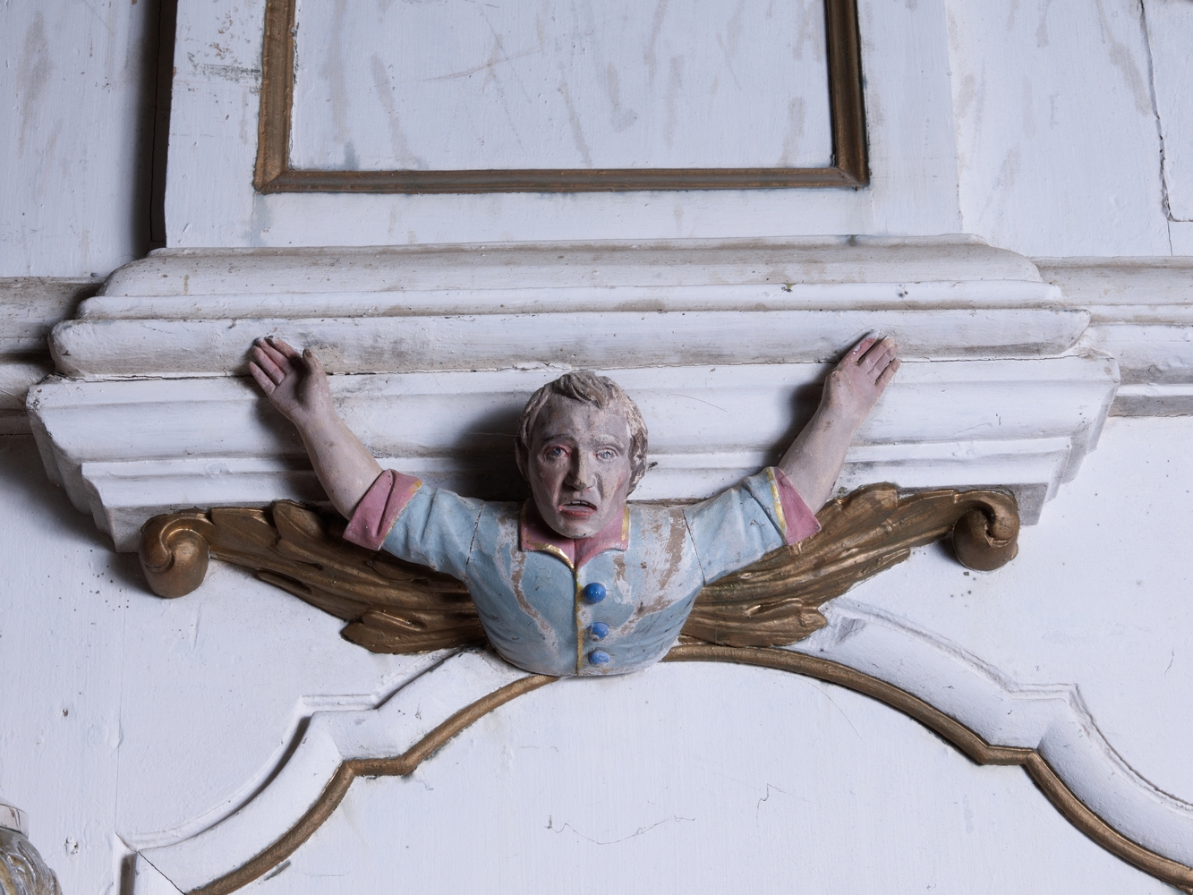 Prat, le bourg : église paroissiale Saint-Pierre, vue intérieure, décor du lambris du choeurImmatriculation