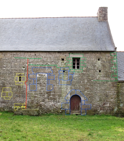 Plouaret, Guilquin : métairie noble, élévation antérieure orientée au nord. Logis ouest. En jaune : logis est. En rouge : collage de maçonnerie. En bleu : ouvertures primitives. En vert : modifications secondairesImmatriculation