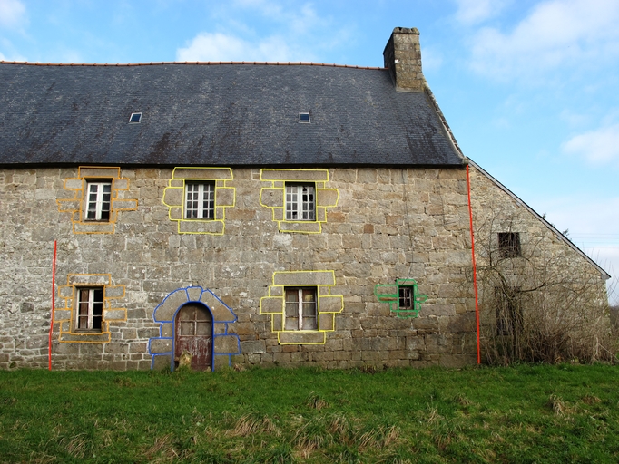 Plouaret, Guilquin : métairie noble, élévation postérieure orientée au sud, logis est. Au moins trois phases de percement d'ouvertures sont visibles à la lecture de la maçonnerie (bleu, jaune, orange et vert)Immatriculation