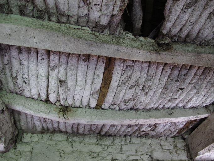 Plouaret, Guilquin : dépendance ouest de la métairie noble (C), poutres, remplissage avec des quenouilles (cylindres constitués de baguettes de châtaignier, de terre et de foin roulé en cylindre), blanchies au lait de chauxImmatriculation
