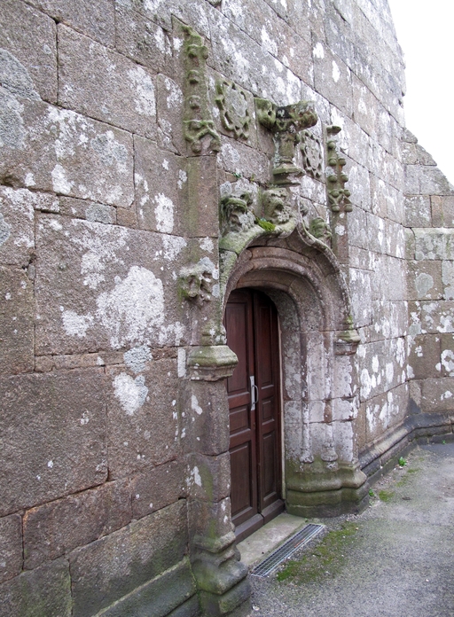 Plouaret : chapelle Sainte-Barbe, porte ouest en anse de panier ornée surmontée d'une archivolte en accolade, choux frisés, fleuron encadré de pinacles et par deux blasons (fin 15e siècle ?)Immatriculation
