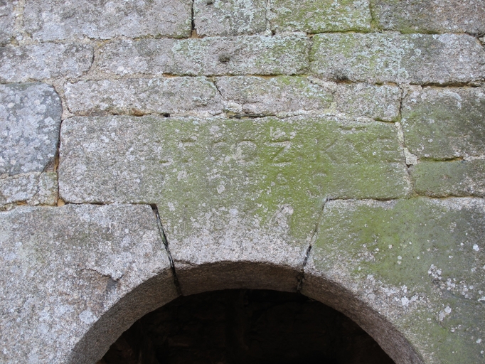 Plouaret, Varveguez : ferme, élévation antérieure orientée nord, porte en plein cintre, linteau portant le chronogramme 1664 et l'inscription AY LE COZ KNE NICOLASImmatriculation