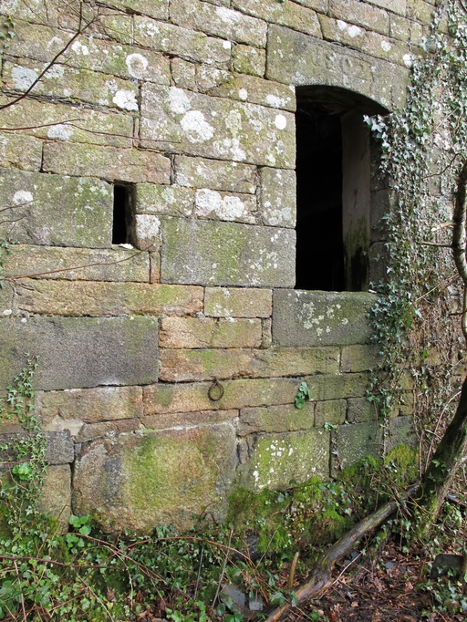 Plouaret, Crec'h an Moudet : ferme, élévation antérieure, fenêtre du rez-de-chaussée portant le chronogramme 1802. On peut voir dans la maçonnerie l'emplacement du saloir mural ainsi que son jourImmatriculation