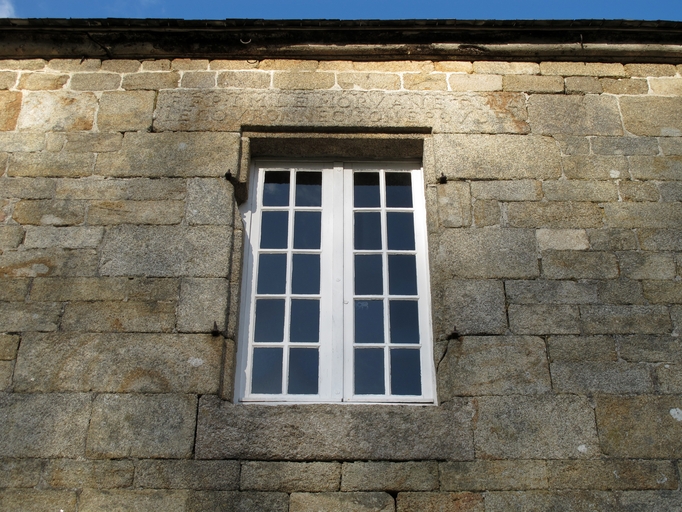Plouaret, Kerdanet : ferme, élévation antérieure, travée centrale, fenêtre. Le linteau porte l'inscription : F. F. P : I M. [Jean-Marie] LE MORVAN ET M A [Marie-Anne] LE GOURONNEC SON EPOUSEImmatriculation