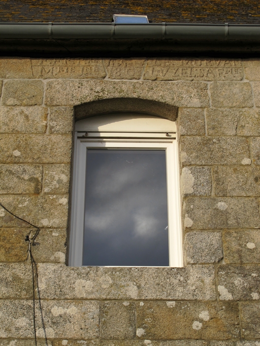 Plouaret, la Garenne : ferme, étage, fenêtre centrale. Les pierres portent le millésime 1810 et l'inscription F.F.P. [fait faire pour] : P.re [Pierre] YVES LE MORVAN M.rie [Marie] J.ne [Jeanne] 1810 LUZEL SA F.ME [femme]Immatriculation