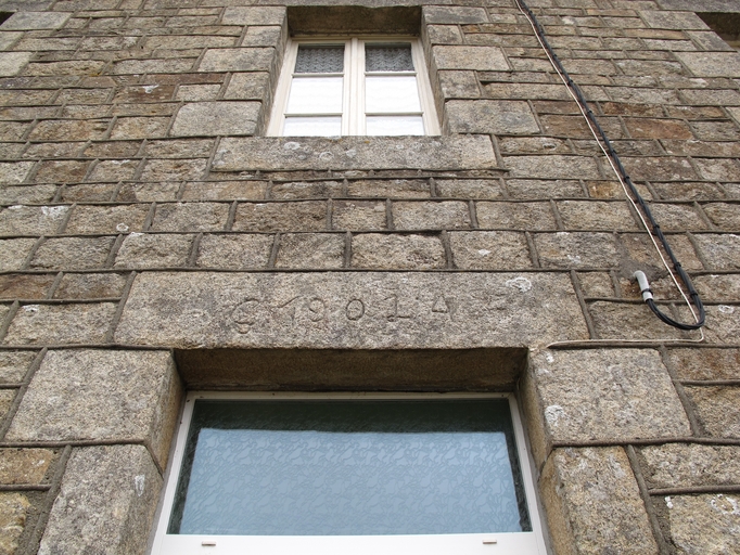 Plouaret, Porz ar Bruno : ferme, logis n° 2, élévation antérieure. Le linteau de porte porte le chronogramme 1914Immatriculation
