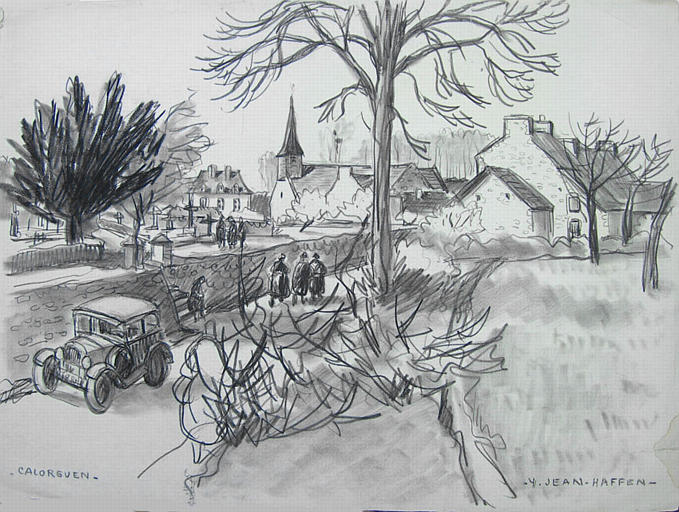 Le bourg de Calorguen, dessin d'Yvonne Jean-Haffen, Dinan : Maison de la Grande VigneImmatriculation