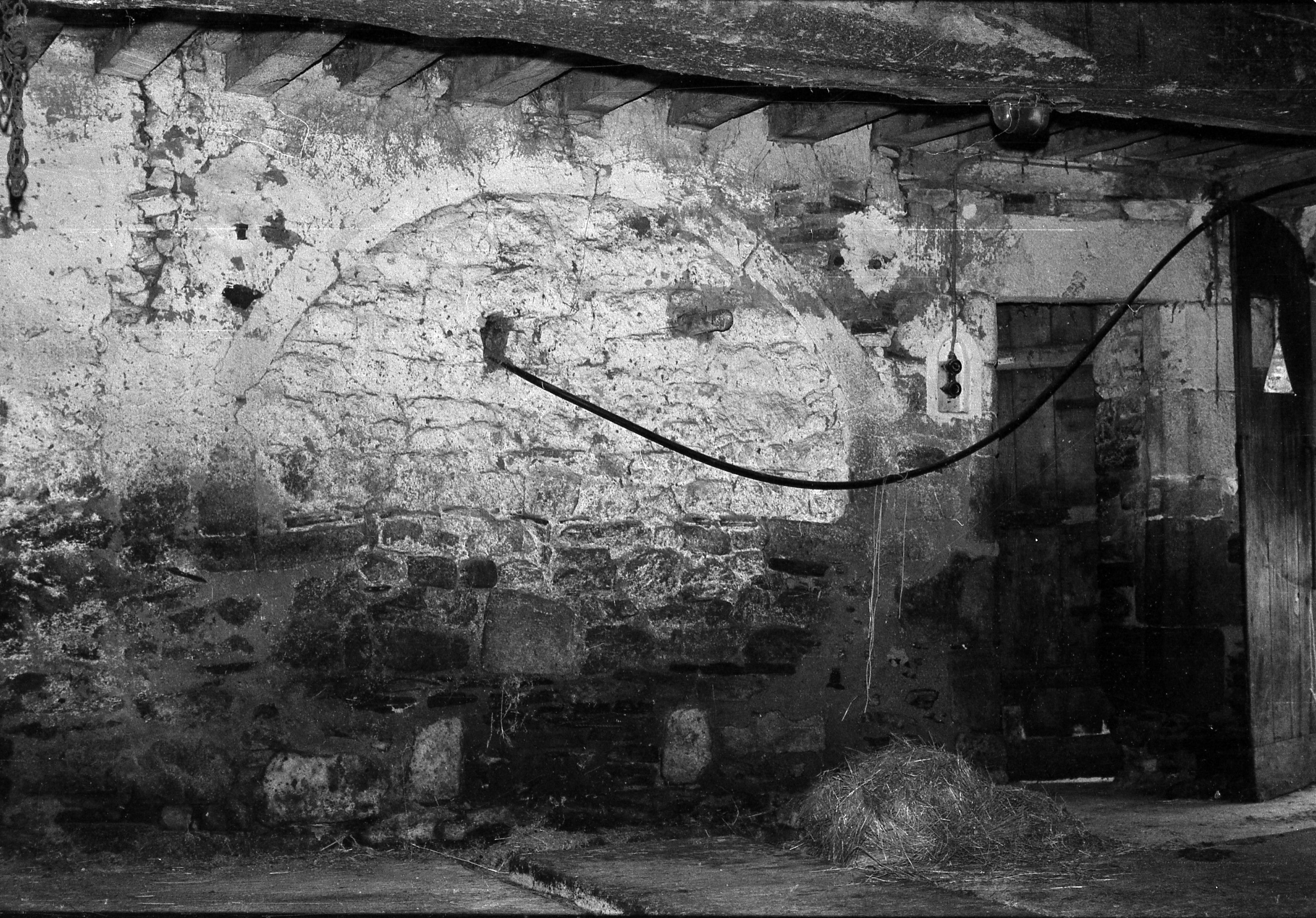 Vue intérieure, salle de l'est, mur de refend avec vaisselier mural et porte de communication vers la pièce d'exploitation, avant restauration (archives privées)Immatriculation