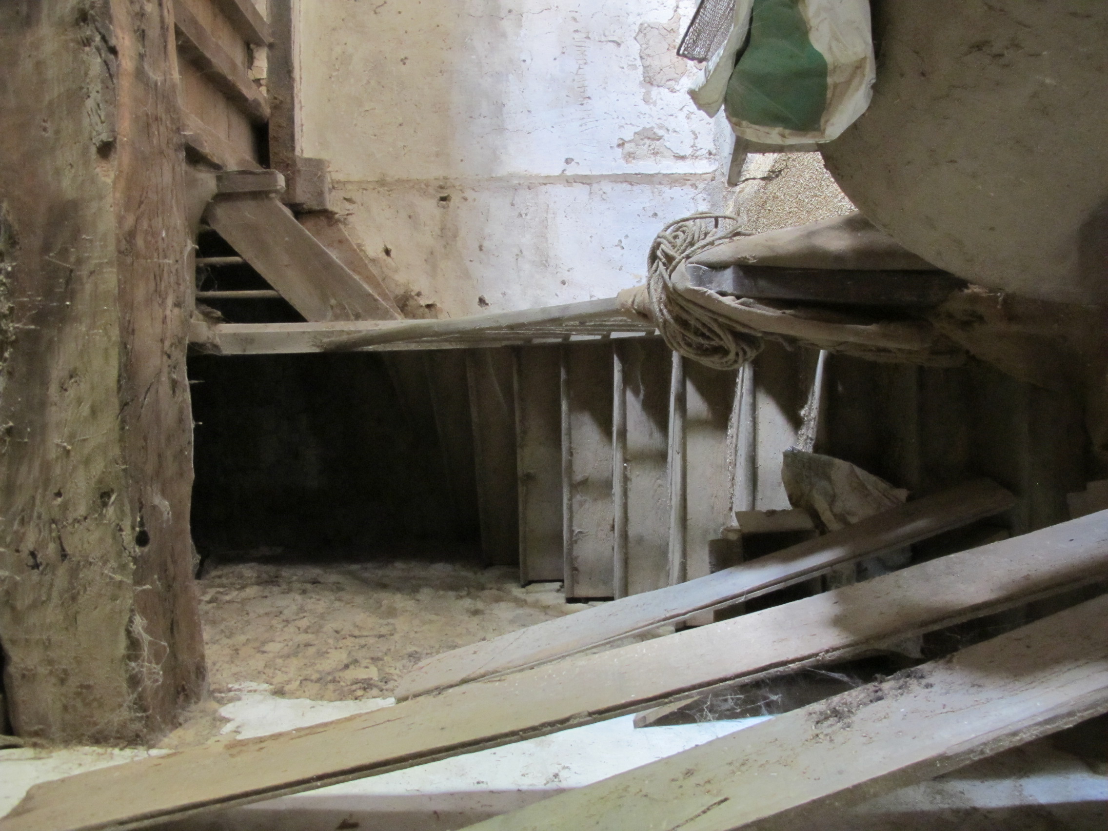 Salle du rez-de-chaussée, transformée en dépendance, avec escalier en charpente situé dans l'angle nord ouestImmatriculation