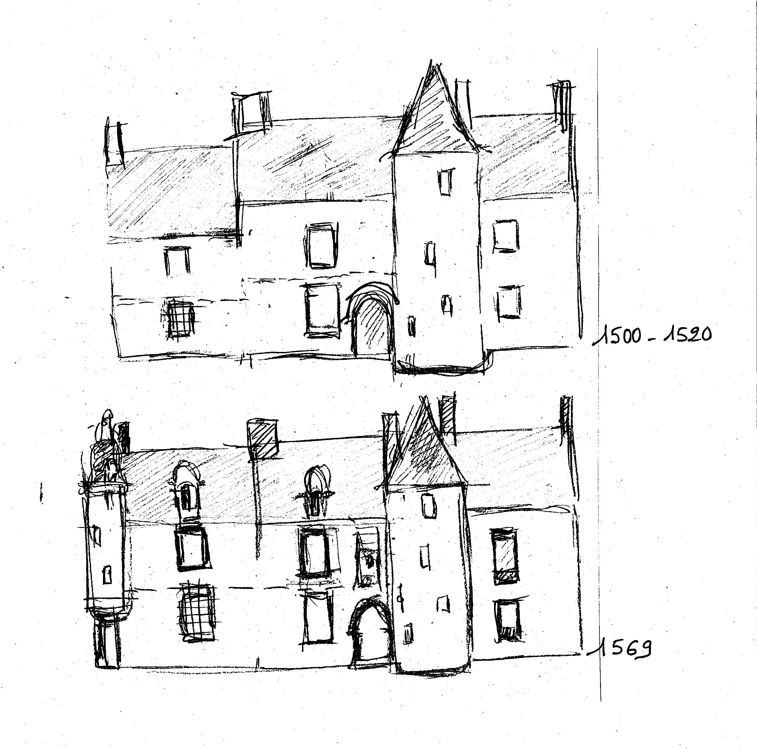 Hypothèses de restitution de la façade vers 1614 (date de l'extension de la tourelle d'angle sur pile)Immatriculation