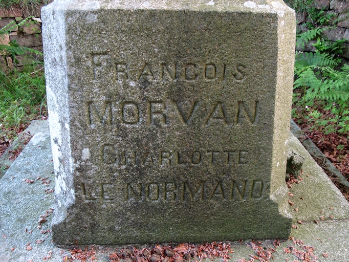 Pluzunet, carrefour des routes départementales n° 32 et 33 : croix de mission, détail du socle. Inscription : FRANCOIS MORVAN ; CHARLOTTE LE NORMANDImmatriculation