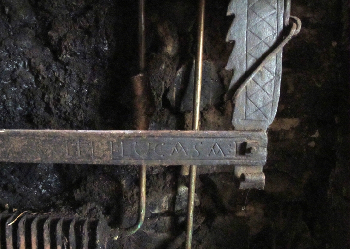 Pluzunet, Kerlistouedou : ferme, vue intérieure, cuisine, détail de la cheminée, crémaillère ancienne gravée au nom de son propriétaire L:LUCAS SA:Immatriculation