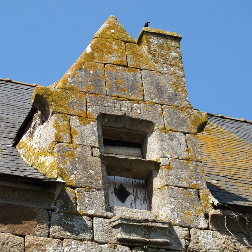 Pluzunet, Pen an Crec'h : manoir puis ferme, élévation orientée vers le sud-sud-est, détail de la lucarne ouest. Elle porte une inscription malheureusement illisibleImmatriculation