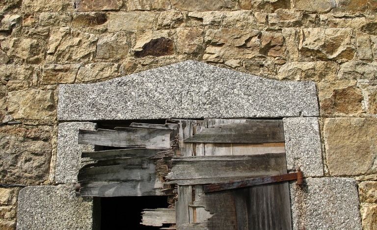 Pluzunet, Lann Vihan : étable (1912), détail du linteau en bâtière portant le millésimeImmatriculation