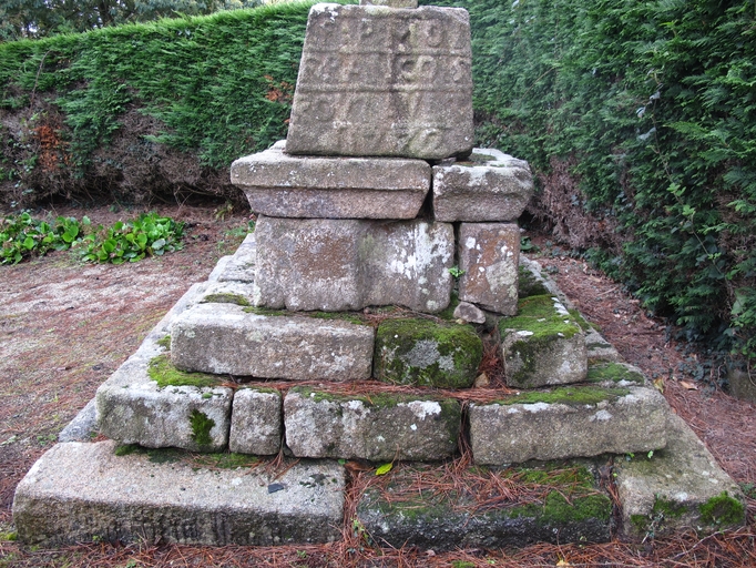 Caouënnec-Lanvézéac, Caouënnec, Castel Pic (rue) : croix (1772), détail du socle et du soubassementImmatriculation