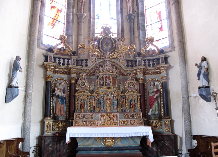Caouënnec-Lanvézéac, bourg de Caouënnec : église paroissiale de Notre-Dame, vue intérieure, choeur, maître-autel sculpté et peint (17e siècle ; classé au titre des Monuments historiques)Immatriculation