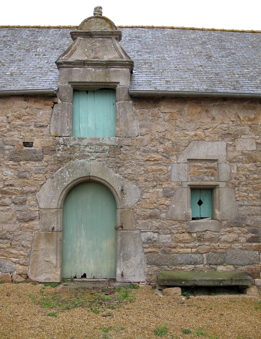 Cavan, Bois Riou : manoir, bâtiment nord, élévation antérieure orientée vers le sud-est, détail des ouvertures, porte en arc plein cintre et lucarne ouvragéeImmatriculation