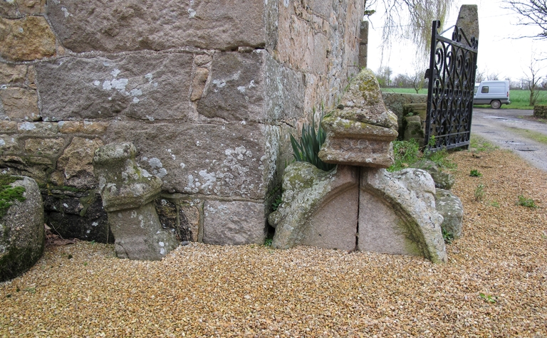 Cavan, Bois Riou : manoir, logis et pavillon nord flanquant l'entrée, vue de détail de pierres sculptées (16e siècle)Immatriculation