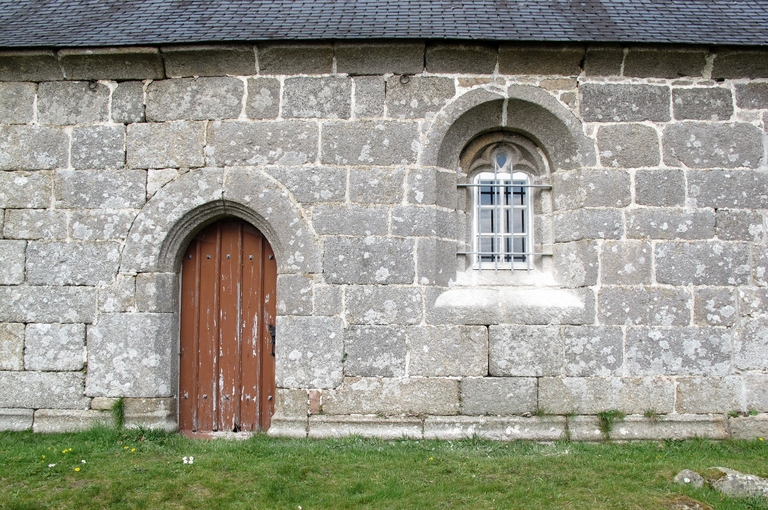 Tonquédec, Kerrivoalan : chapelle Notre-Dame, élévation sud, porte et fenêtre, vue de détailImmatriculation