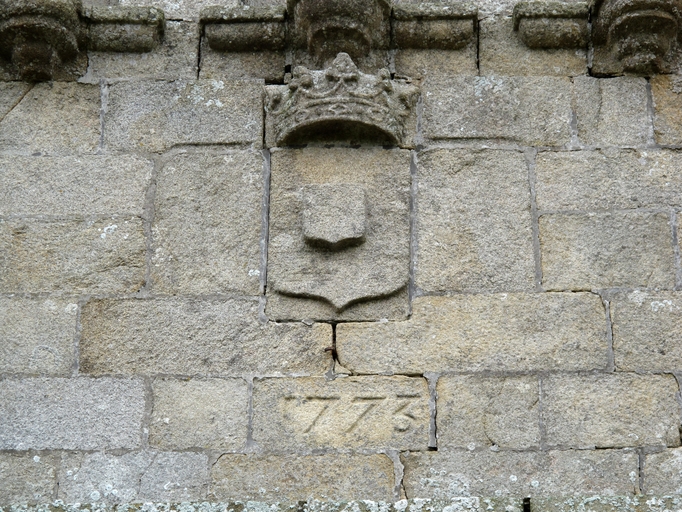 Tonquédec, le bourg : église paroissiale Saint-Pierre, tour, vue de détail. Armoiries et millésime 1773Immatriculation