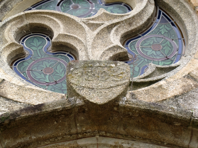 Tonquédec, le bourg : église paroissiale Saint-Pierre, porche sud, vue de détail. Millésime 1835Immatriculation