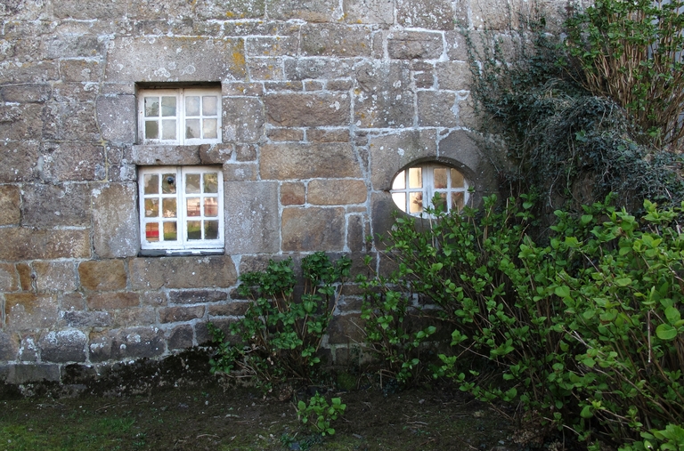 Tonquédec, Goz Vouden : manoir, élévation antérieure orientée vers l'est-nord-est, rez-de-chaussée, fenêtre à traverse et oculus ovoïdeImmatriculation