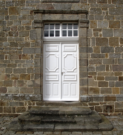 Tonquédec, le bourg, 1 Grande rue (Hent Braz ) : manoir, élévation antérieure orientée vers le sud, travée centrale, porteImmatriculation