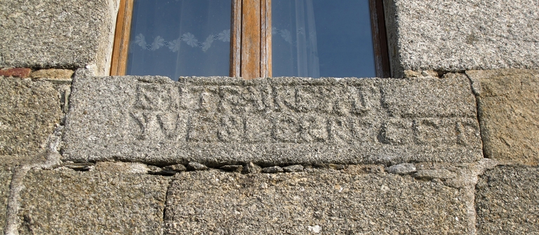 Tonquédec, L'Hôpital : logis de ferme, élévation antérieure orientée vers le sud, appui, vue de détail. Il porte l'inscription suivante : FAIT FAIRE PAR YVES LE PRECImmatriculation