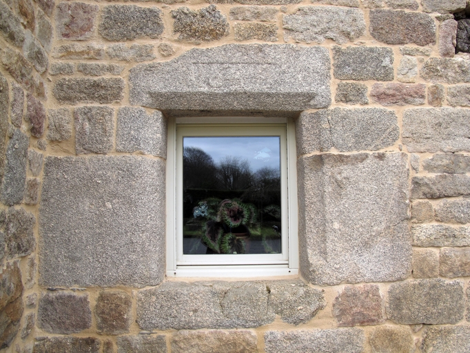 Tonquédec, Lestang (Stang Ar C'hlan) : ferme, élévation antérieure orientée vers le sud-est, logis nord, fenêtre à linteau daté de 1644, vue de détailImmatriculation