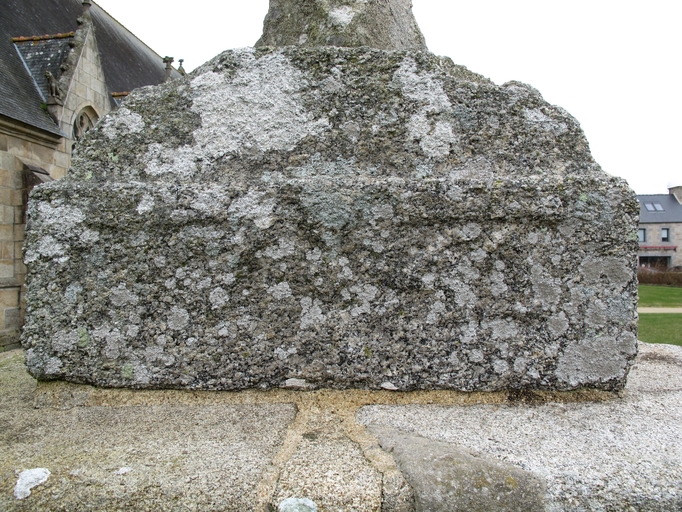 Tonquédec, le bourg, place de l'église : croix monumentale, socle portant le millésime 1742Immatriculation