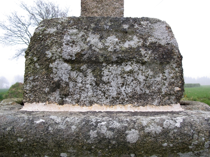 Tonquédec, Hent Meur : croix de chemin, socle, vue de détail. Il porte l'inscription suivante : F : NICOLImmatriculation