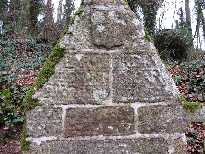 Tonquédec, le Château : fontaine, vue de détail. Le fronton porte l'inscription suivante : PAR L ORDRE. DE. M.KLEAN PUOST. FE. TONQDECImmatriculation