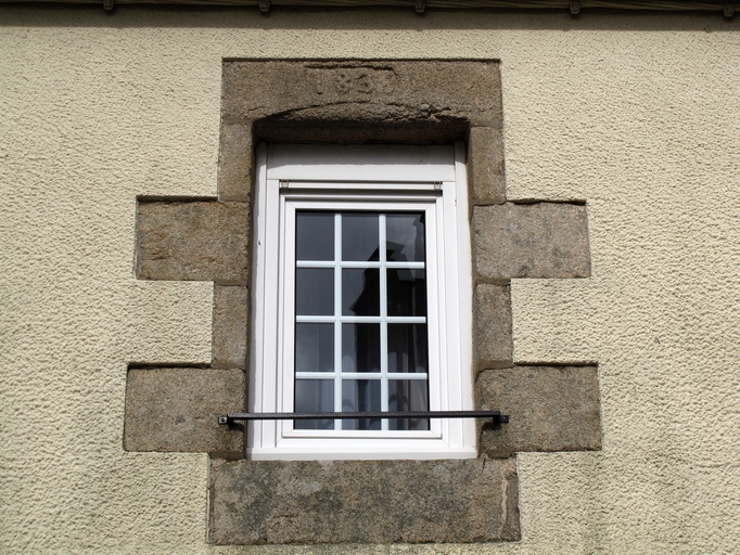 Tonquédec, le bourg, rue du Lavoir : maison, fenêtre à linteau portant le millésime 1835, vue de détailImmatriculation
