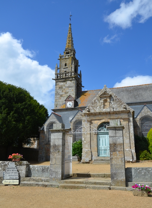 Prat, le bourg : église paroissiale Saint-Pierre, clocher et porche sud, vue généraleImmatriculation