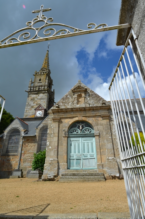 Prat, le bourg : église paroissiale Saint-Pierre, clocher et porche sud, vue généraleImmatriculation