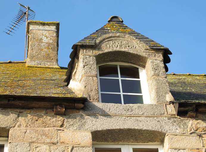 Prat, Kermerrien : manoir puis ferme, élévation antérieure orientée vers l'est, vue de détail. La lucarne porte l'inscription et le millésime suivant : R : LE HUEROU / 1772Immatriculation