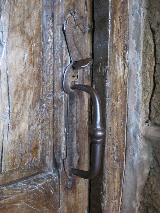 Prat, Kermerrien : manoir puis ferme, vue intérieure, rez-de-chaussée (actuel couloir), porte arrière à linteau droit desservant la tour d'escalier, huisserie, porte et système de fermeture (2e moitié18e siècle)Immatriculation