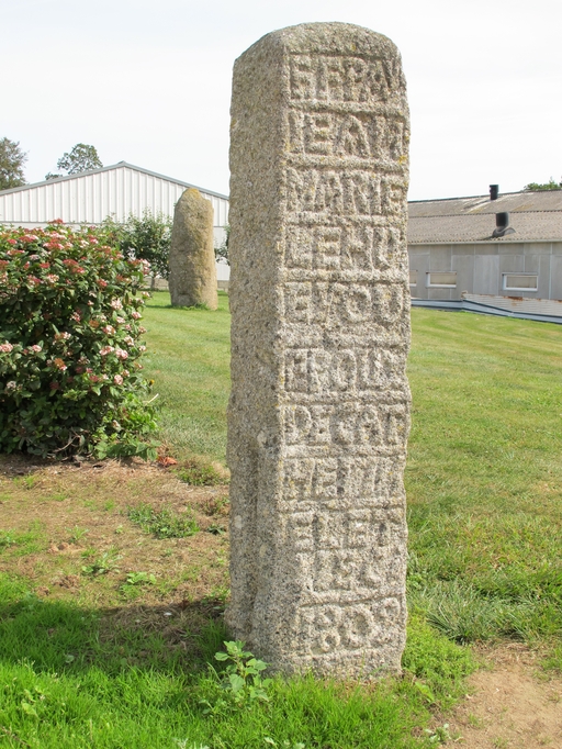Prat, Kernigoual : pierre portant le nom des propriétaires de la ferme et un millésime. On peut lire : F : F : PAR JEAN MARIE LE HUEROU EPOUX DE CATHERINE ELET[?] 1802Immatriculation