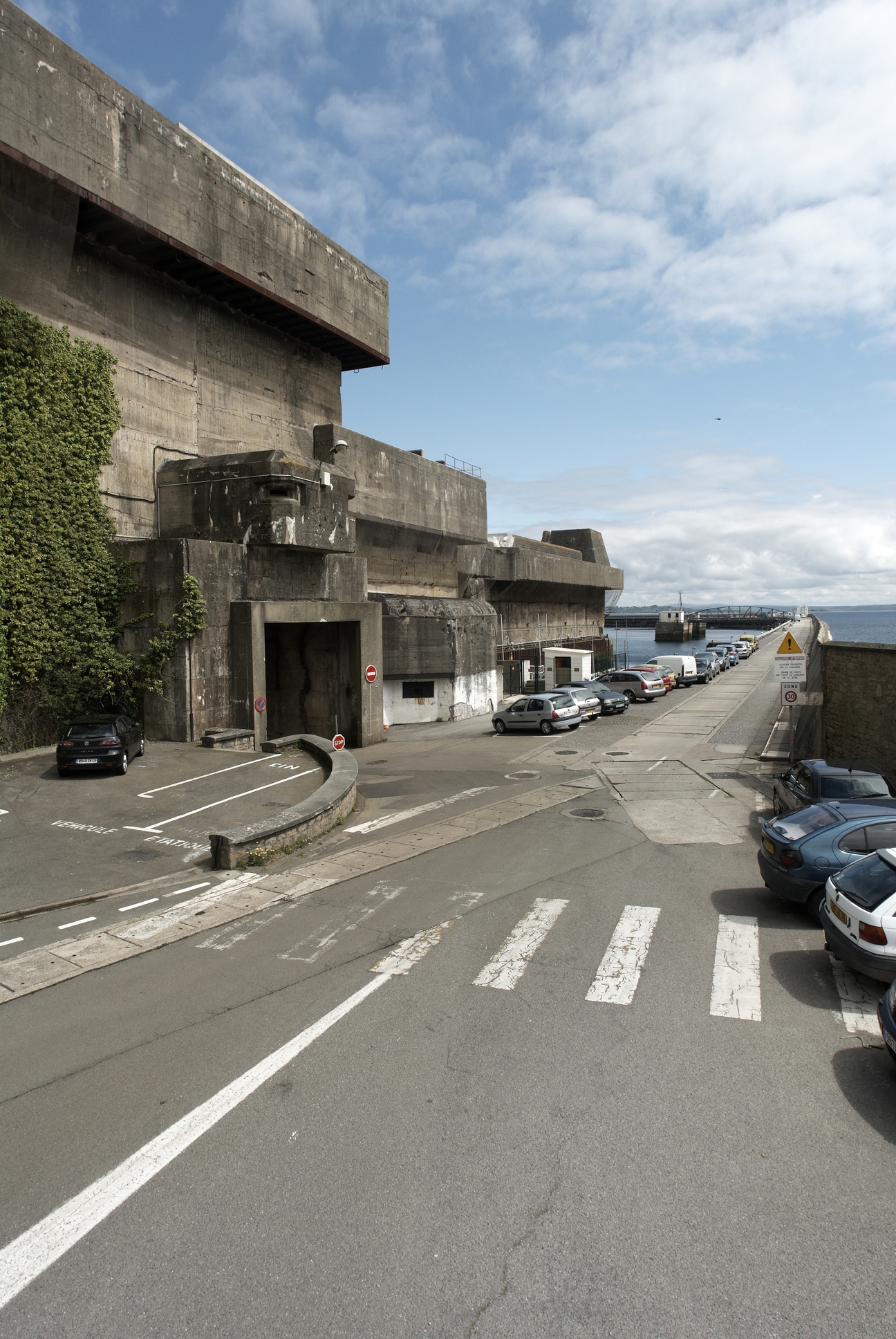 Vue de la base de sous-marins prise depuis l´intérieur de l'enceinte de l´arsenal : entrée ouest et abordsImmatriculation