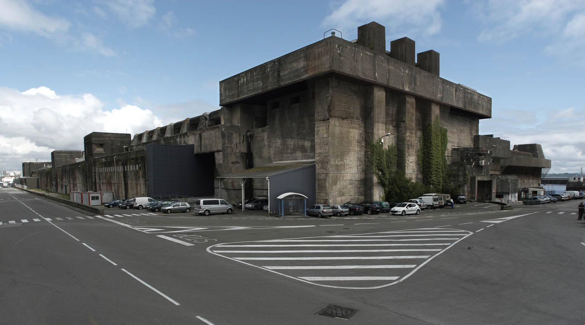 Vue de la base de sous-marins prise depuis l´intérieur de l'enceinte de l´arsenal : angle nord-ouestImmatriculation