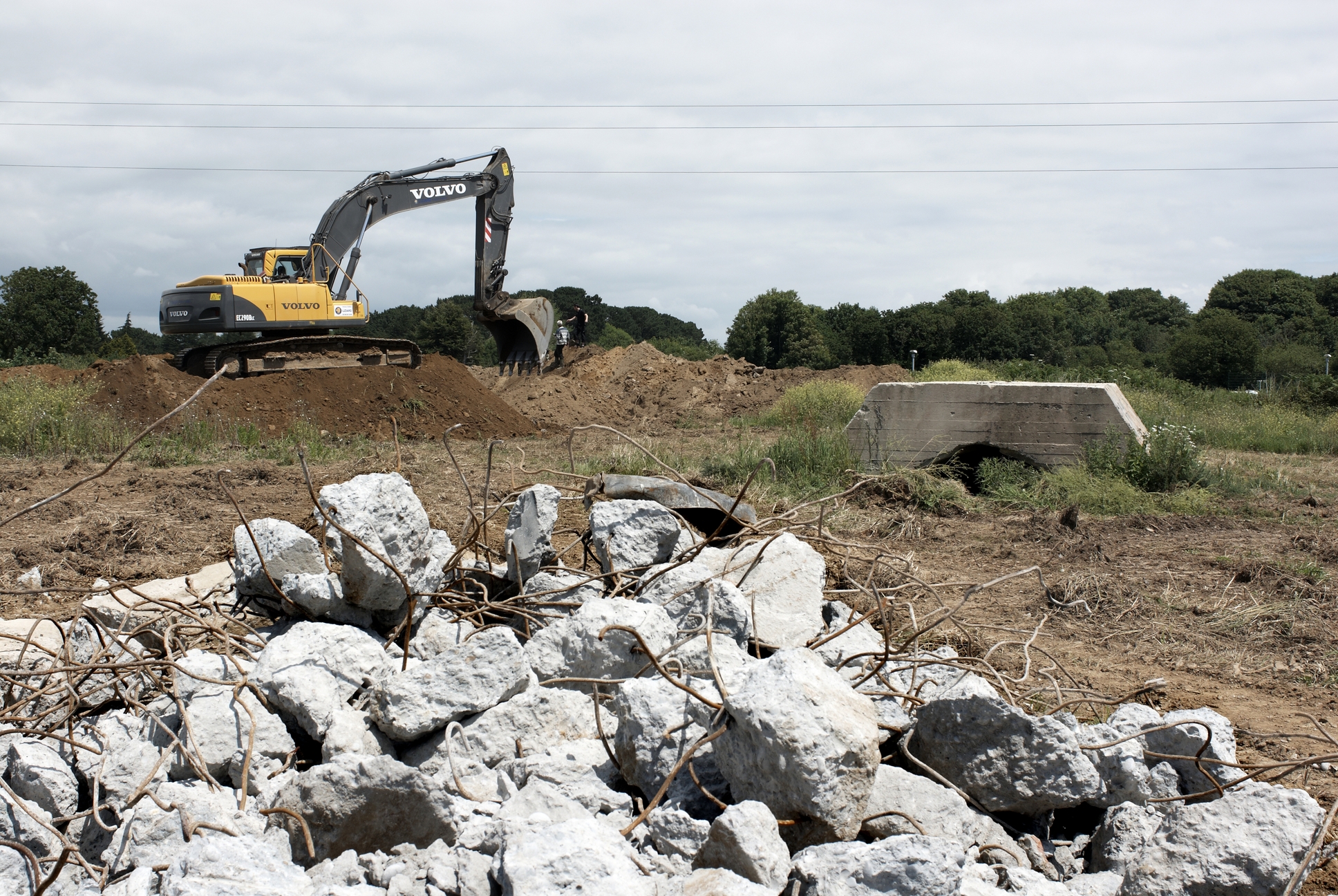 Déconstruction des bunkers. Au premier plan, des morceaux de béton avant le tri. Au second plan, bunker de type tôle métro (Wellblech)Immatriculation