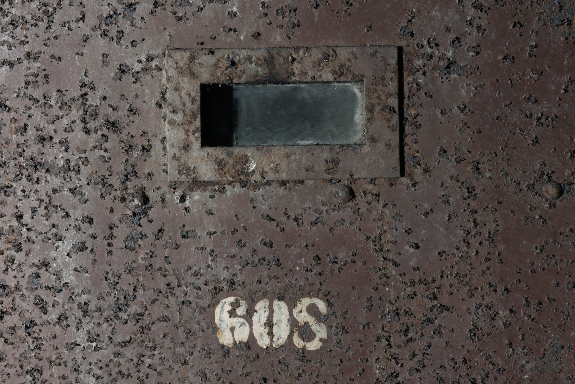 Vue intérieure : détail de la porte coulissante, judas et marquage (608 ?) (état en 2009)Immatriculation