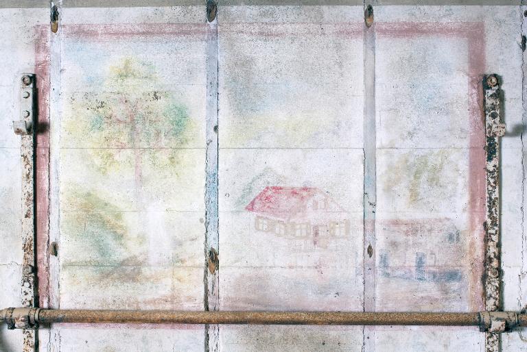 Vue de la peinture murale n° 2 : paysage de campagne (arbres, maison couverte en tuile), photographie réalisée le 11 mai 2009Immatriculation