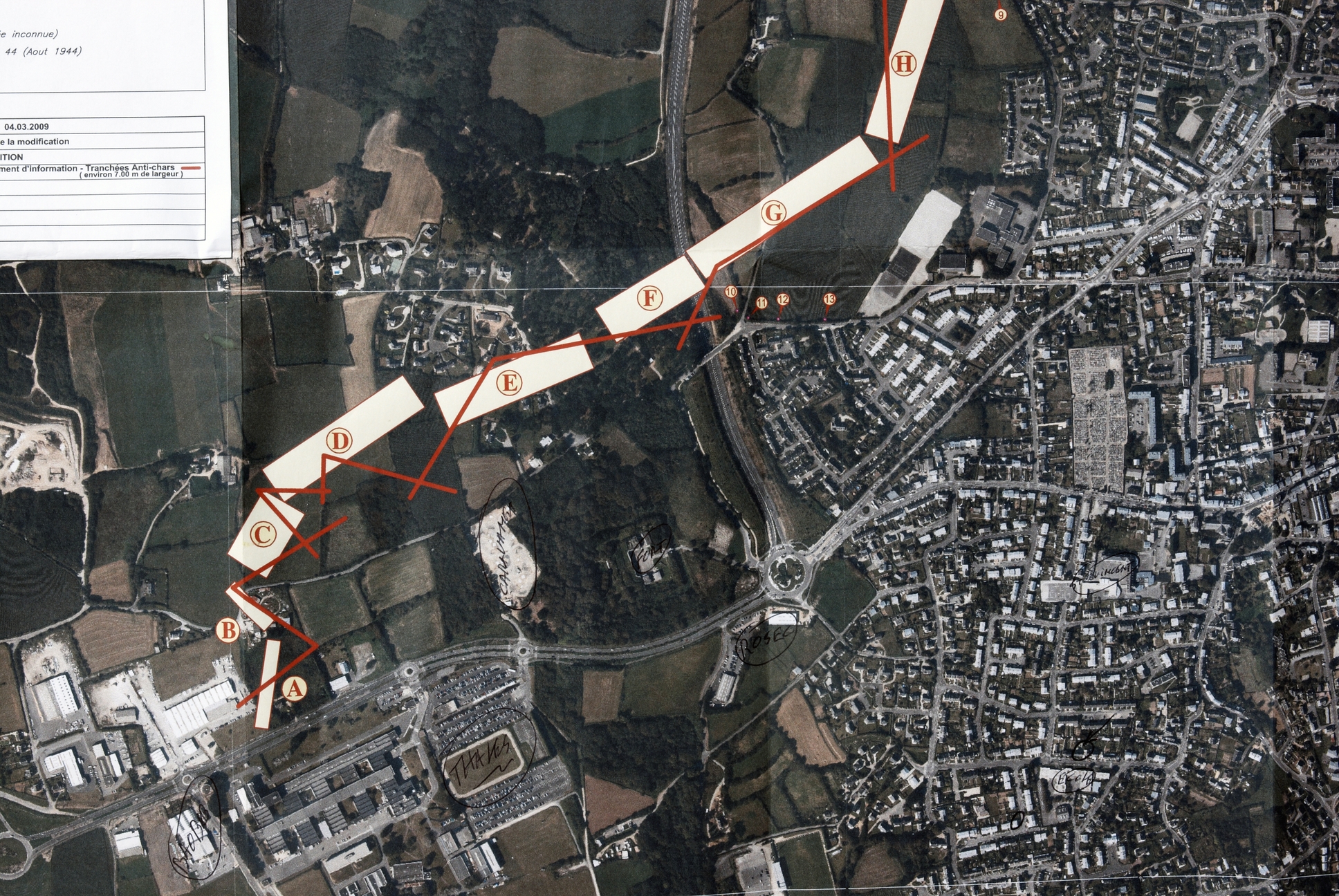 Brest, Zone d'aménagement concerté (ZAC) de Fontaine Margot : plan orthophotographique des tranchées antichars et des blockhaus (Ville de Brest, 4/03/2009)Immatriculation