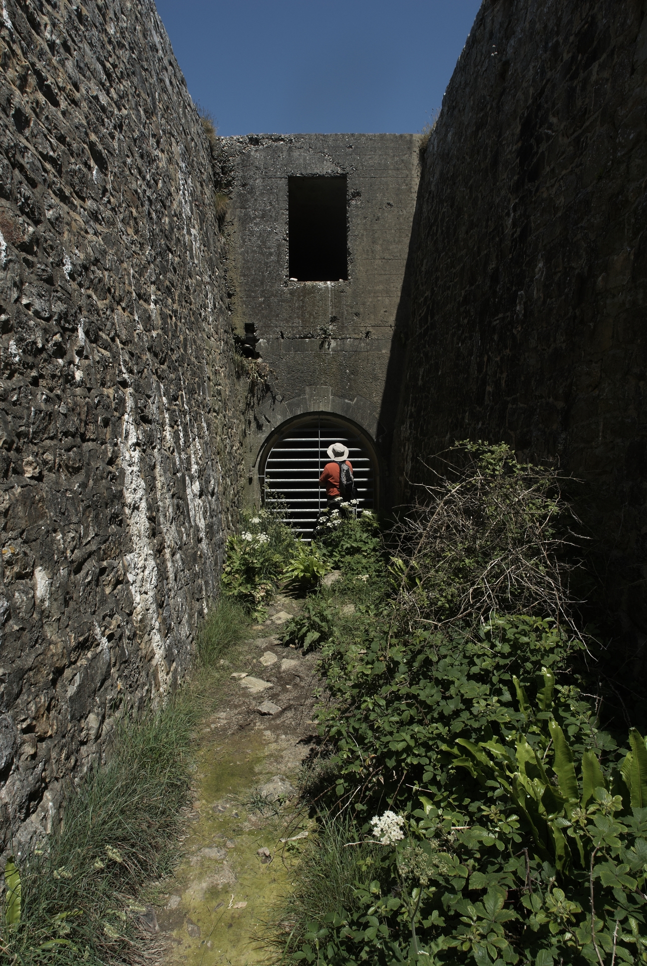 Vue de l'entrée en arc plein cintre du magasin à poudre sous roc de la batterie de mortier. Daté 1891, il a été aménagé dans le fossé de la batterie de mortierImmatriculation