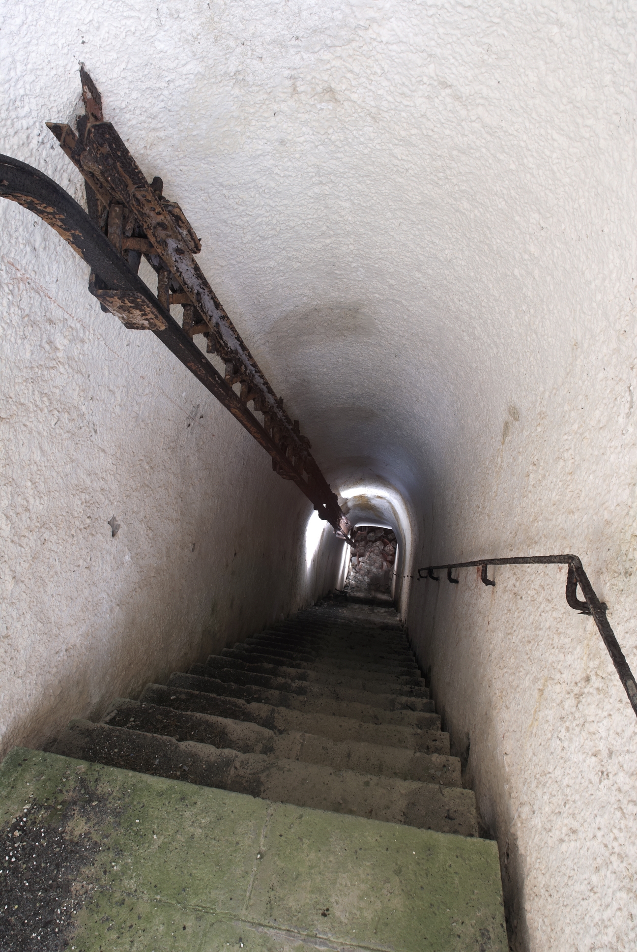 Camaret, pointe du Toulinguet : magasin à poudre sous roc (construction vers 1892), escalier d'accès et monorail élévateurImmatriculation
