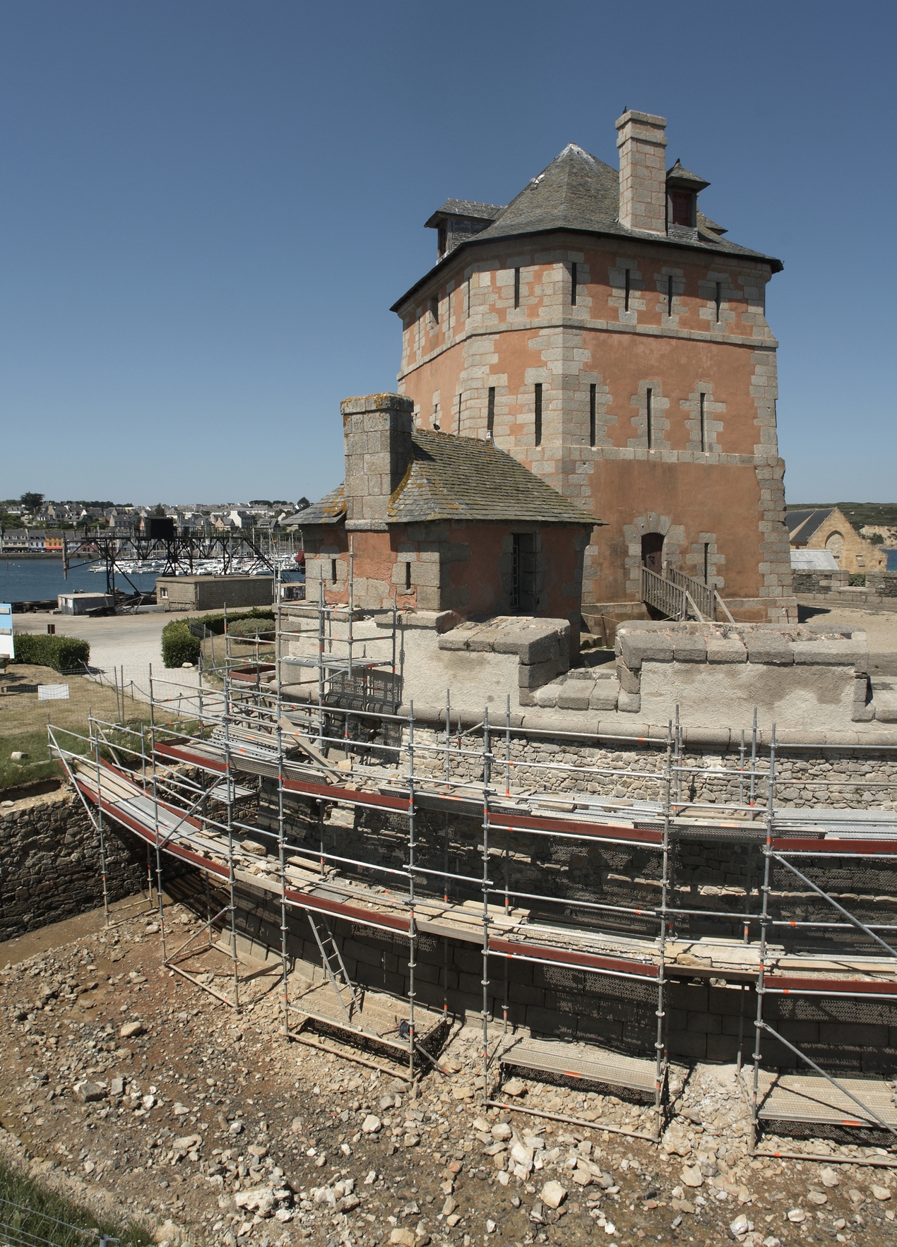 Camaret-sur-Mer : vue de la tour Vauban, restauration de l'escarpe de la batterieImmatriculation